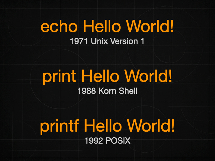 3. print — invented by David Korn for the Korn shell (mid-1980s)
