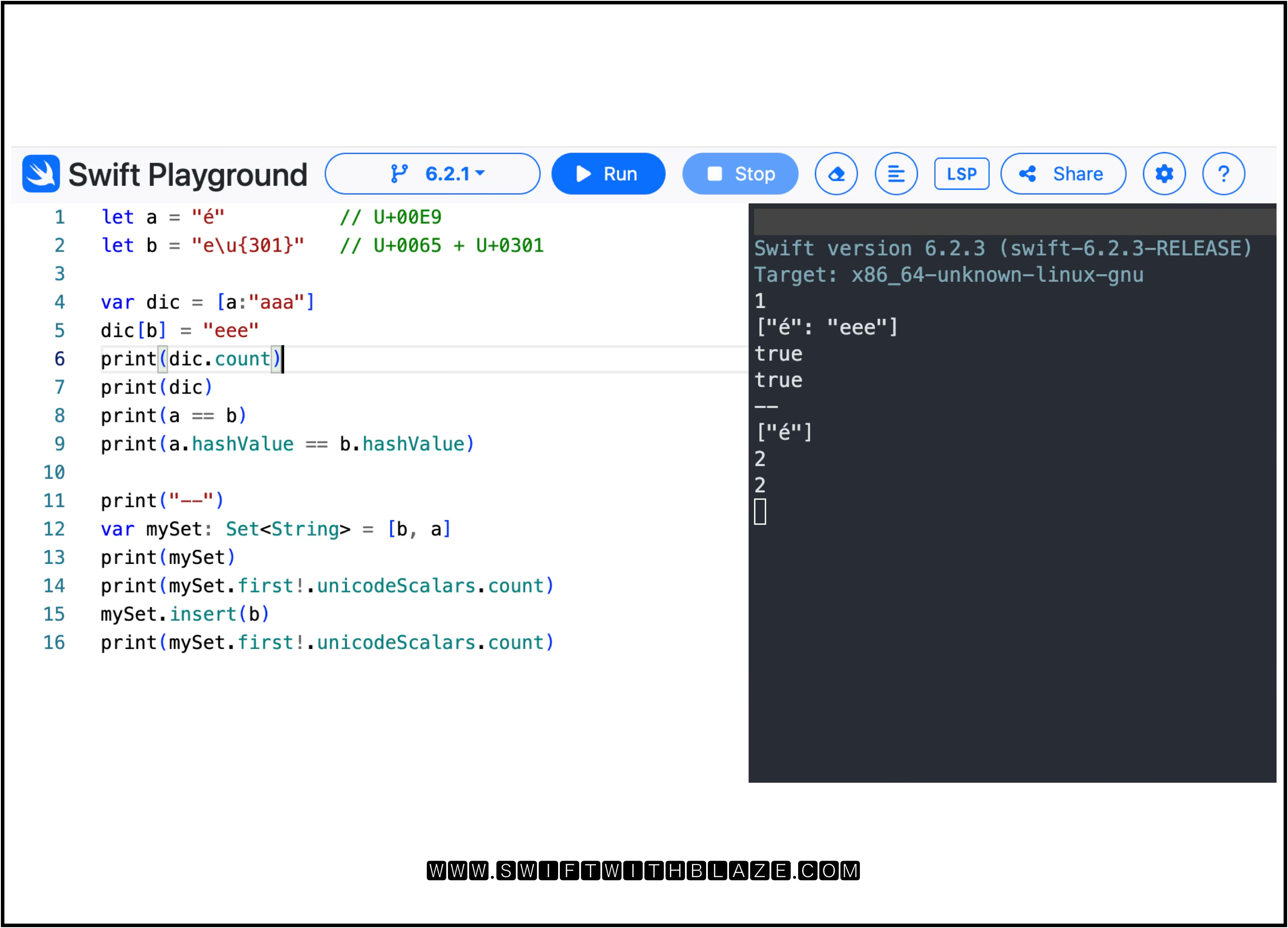 You can use SwiftFiddle at https://swiftfiddle.com, where you pick a Swift version, write code, and run it in the browser. Because all versions execute on the same Linux/ICU environment, Unicode behavior β including String equality and canonical equivalence β is consistent across tests.