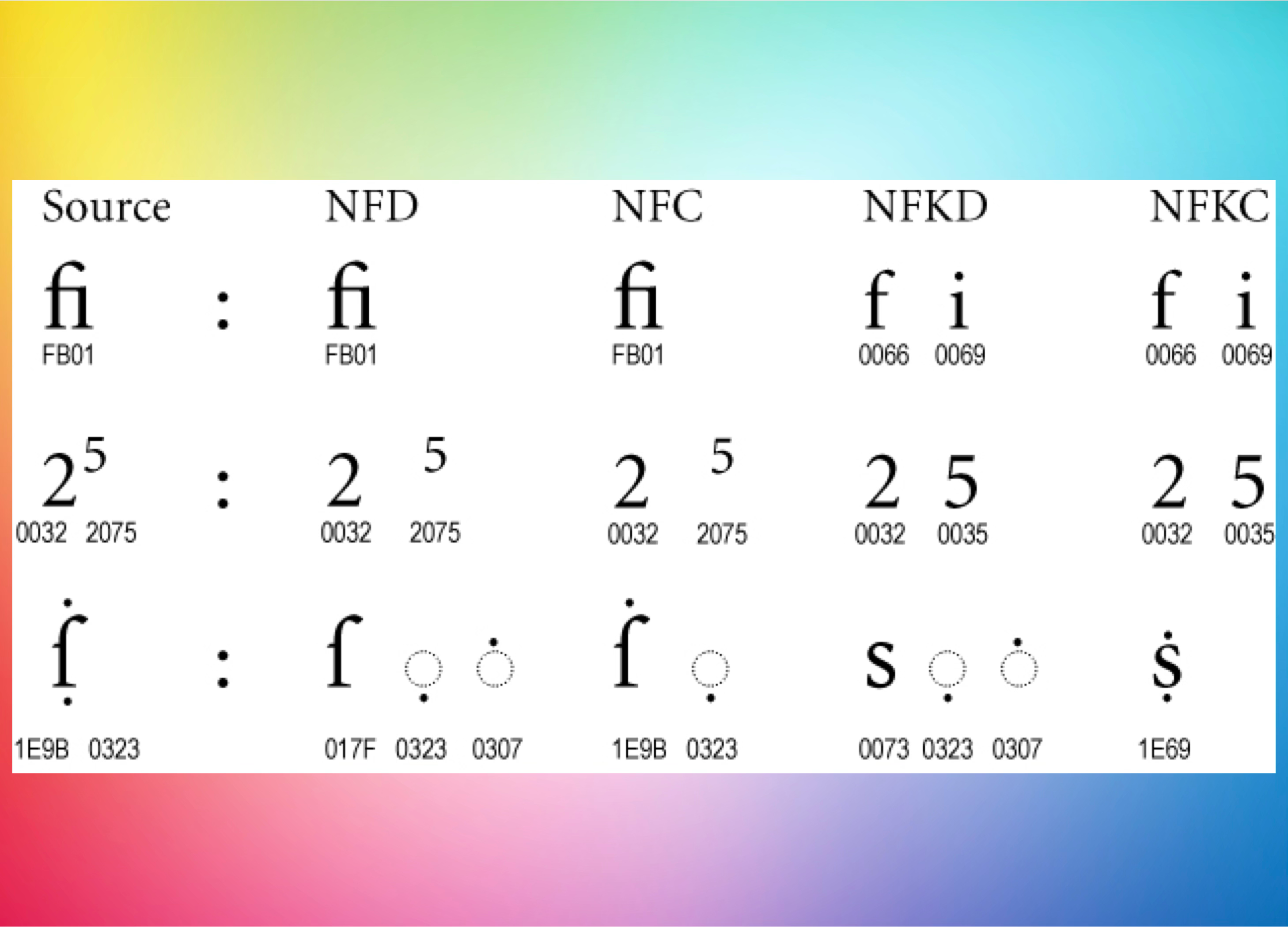 In Swift, a String is a collection of extended grapheme clusters, not Unicode scalars or UTF-16 code units. What looks like one character on screen can be composed of multiple scalars. Normalization (NFC vs NFD) affects equality and storage. Compatibility normalization (NFKC) goes further: it folds compatibility characters into their canonical equivalents.