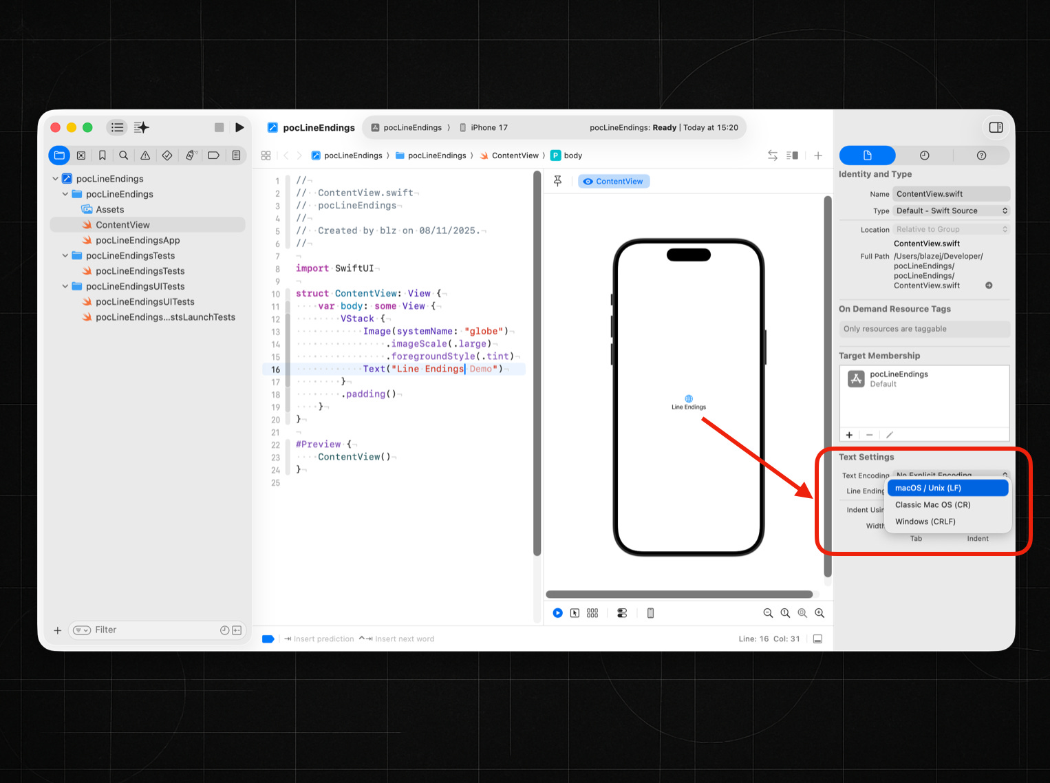 Line Endings Option in Xcode’s (version 26.1) Identity Inspector in Text Settings Section, seems to be broken. It does not detect and does not convert line endings in current file. Checked with a project under git, no diffs. The option can be set as well on the developer level in Xcode Settings but still no effect on newly created files