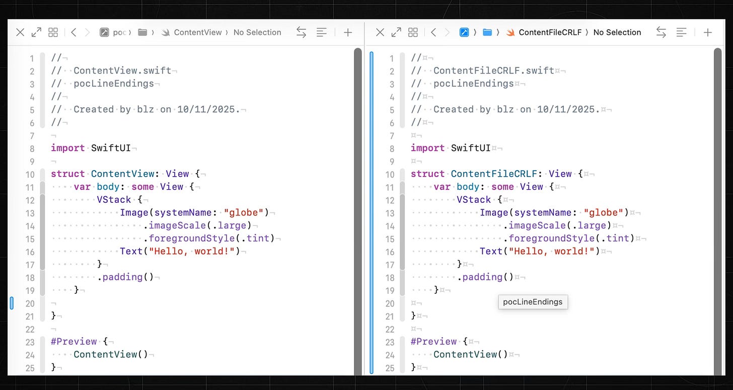 A developer-level breakdown of line endings, cross-platform quirks, and Xcode’s misleading setting.